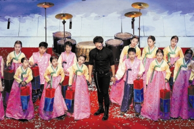 A general view of the closing ceremony of the Asian Games on Haixinsha Island in Guangzhou on Saturday night. (Inset) South Korean pop singer Rain performs with children during the closing ceremony. South Korea’s Incheon will host the next Asian Games.Xinhua |