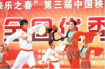 ??? THE 3rd China Yangge Festival was launched in Jiaozhou on May 25. A total of 11 well-known yangge teams from across the country attended the competition. Nearly all the yangge performances on the opening night were national intangible cultural heritage, attracting an audience of more than 20,000 people. The opening gala was hosted by CCTV’s Ren Luyu and Dong Yi and joined by famous artists Tan Jing and Pan Qianqian. The festival was first held in Jiaozhou in 2008. This year’s event will end in June and more activities, such as yangge dance parties, a stone exhibition and a food festival, will be held during the event. (Wang Yuanyuan, Wang Liyan) |