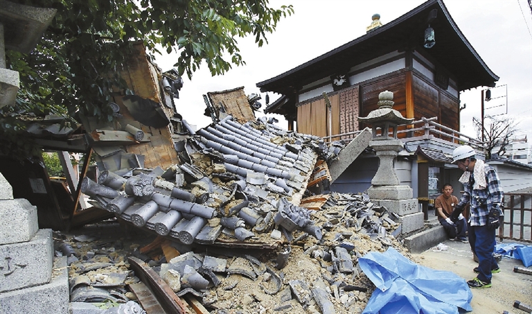 Damage at Myotoku-ji temple caused by an earthquake is seen in Ibaraki, Osaka prefecture, western Japan, on Monday. The 5.3 magnitude quake knocked over walls and set off scattered fires around metropolitan Osaka on Monday, killing at least three people and injuring more than 300.