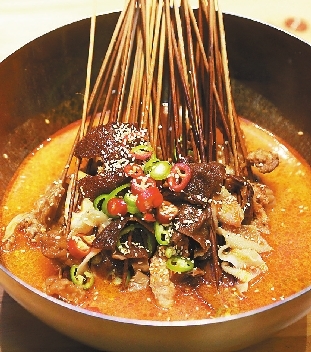 Chuanchuan, vegetables and meat skewers served in spicy broth, is a version of hot pot that is more popular than typical hot pot in Sichuan. Sliced raw meat, vegetables, sausages, shrimps, in fact almost anything edible, are impaled on a bamboo skewer and dipped into a pan of boiling hot spicy soup. It’s called chuanchuan because the food is put on a bamboo stick.