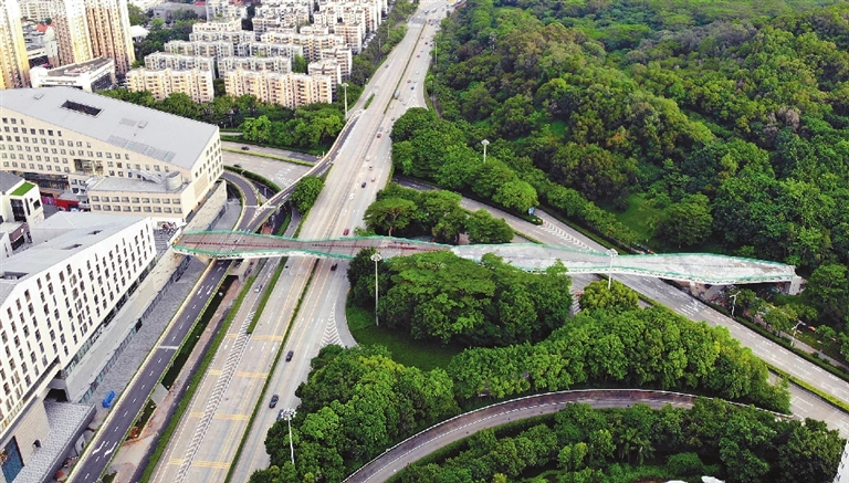 AN aerial corridor connecting Lianhua Hill Park and Bijia Hill Park that spans three urban roads — Huanggang, Lianhua and Caitian roads — in Futian District has been completed.