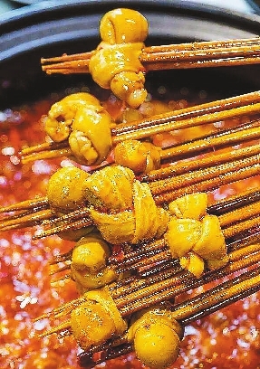 Chen Xiaochun 654789759@qq.com SHOWERED with tons of positive comments online, the popular Chengdu restaurant “Gangguanchang Wuqu Xiaojungan Chuanchuan Xiang” in Longhua District waits upon long queues of customers every day. Even rainy days can’t deter patrons. The restaurant, whose name literally translates to “Steel Pipe Plant Fifth District Little Chicken Gizzard Skewer,” recently celebrated its first anniversary. It is the first branch of this brand in Shenzhen. Chuanchuan is a kind of Sichuan spicy hot snack eaten from a bamboo stick. The founder of the brand, Sister Gu, is a Chongqing native who has a good understanding of the Sichuan and Chongqing cuisines, according to a source from the branch restaurant. Gu is a retired worker from the Chengdu Seamless Steel Pipe Factory. She set up a stall selling chuanchuan, which quickly became popular. Later, supported by the chairman of Chengdu Bazi Hot Pot, she blended the flavor of Sichuan cuisine with Chongqing cuisine, giving birth to the restaurant’s unique-tasting chuanchuan today. The most famous specialty of the brand, chicken gizzard skewer made with a secret recipe, has successfully won the hearts of most foodies. The seven combinations of beef with different food including bamboo shoot, celery and fragrant-flowered garlic also make everyone’s mouth water. As in other chuanchuan restaurants, one’s skewers of raw ingredients are first chosen from large fridges at the front of the restaurant. Popular choices include quail eggs, shrimp dumplings, tofu and an assortment of different local mushrooms. Once you’ve made your selection, bring your tray of skewers to your table to cook them in a spicy hot pot. You can also choose a non-spicy soup base if preferred. While you’re waiting for your food, choose a dipping sauce to accompany your skewers when they are cooked: a dry sauce of ground peanuts, chili powder and cilantro is excellent with the steaming chuanchuan bites. |