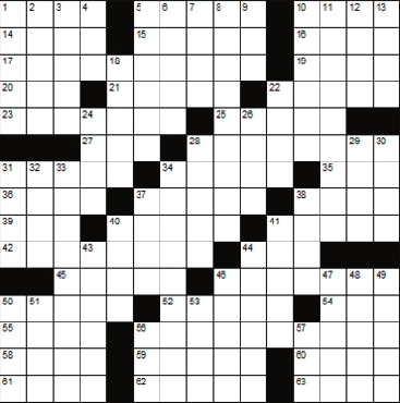 Across 1. Angers 5. Chaff 10. Ends a prayer 14. Dikes 15. Make fun of 16. Bristle 17. Visible aspect 19. Snare 20. Best seller 21. Creepy 22. Formal orders 23. Amazing adventure 25. A nymph of lakes 27. A parcel of land 28. Enlightening 31. Thin piece of wood or metal 34. Hold responsible 35. Bother 36. Prompted 37. Anagram of “arson” 38. Blind (poker) 39. Autonomic nervous system 40. Razz 41. Ascended 42. Breeze from behind 44. Cover 45. Handed out 46. Deep purplish red 50. Estimate 52. Muse of love poetry 54. Arrive (abbr.) 55. Hotels 56. Collaborator 58. Bloodsucking insects 59. Tugs 60. Big party 61. One who accomplishes 62. A small island 63. L L L L Down 1. Potato state 2. Speedy 3. Not full 4. South southeast 5. Avenue 6. Weepy 7. Hindu princess 8. On the rise 9. Tiny 10. Off course 11. Lines of longitude 12. French for “state” 13. Short sleeps 18. Fabulist 22. Spouse 24. Skidded 26. Purposes 28. African antelope 29. Anagram of “tine” 30. Secluded valley 31. Leave in a hurry 32. Bluefin 33. Abode 34. Bountiful 37. Train track 38. Assistant 40. It was (contraction) 41. Severity 43. Not greater 44. Most recent 46. Official tree of Canada 47. Area of South Africa 48. Fairy tale character 49. Tapestry 50. Decorate with gold leaf 51. Pearly-shelled mussel 53. Somersault 56. Consumer Price Index 57. Years |