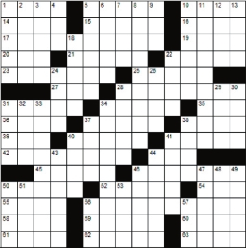 Across 1. Killer whale 5. Overact 10. Press 14. Lion sound 15. Prongs 16. Infamous Roman emperor 17. A supplementary part 19. Deception 20. Foot digit 21. Licorice-like flavor 22. Train tracks 23. Fickle 25. Indian hemp 27. And so forth 28. Cake icing 31. Be in a rush 34. A single-masted ship 35. Petroleum 36. Hodgepodge 37. Not silently 38. Graphic symbol 39. Dowel 40. A framework of beams 41. A friction match 42. Depletes 44. Mayday 45. Basic belief 46. Female siblings 50. Style 52. Wall climbers 54. Liveliness 55. Region 56. Cartographer 58. Essence 59. Active 60. Overhang 61. Being 62. Grave marker 63. “Whoopee!” Down 1. Give a speech 2. Turbine part 3. Provide food for 4. Genus of macaws 5. Cultural 6. Imitate 7. 1 1 1 1 8. Dark and gloomy 9. Eastern Standard Time 10. Child 11. Spiritual 12. By mouth 13. French for “names” 18. Bitchy 22. Coarse file 24. Relating to aircraft 26. Cowl 28. Clean between teeth 29. 3 times 3 30. Delight 31. Expect and wish 32. Gorse 33. Correctness 34. Most slutty 37. Backside 38. Iron oxide 40. Melody 41. Civet-like mammal 43. Ventilate 44. Mountain range 46. A seal 47. Ancient unit of dry measure 48. Late actor Christopher 49. Binge 50. A measuring instrument 51. Anagram of “sire” 53. Cast a ballot 56. Petrol 57. Church bench |