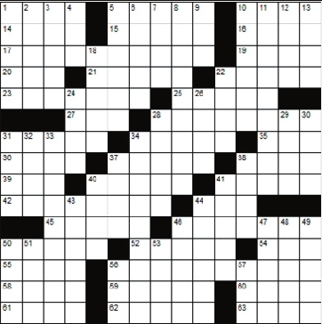 Across 1. Border 5. Utilizers 10. Ammunition 14. Calamitous 15. Yokels 16. Smear 17. Prohibited by official rules 19. Likewise 20. Chemist’s workplace 21. Compacted 22. Marble 23. Soon 25. Unexpired 27. Altitude (abbr.) 28. Made-to-order 31. Twosomes 34. Fop 35. Lyric poem 36. Part in a play 37. Compel 38. Go on horseback 39. A wise bird 40. Sarcasm 41. Nymph chaser 42. Conspirators 44. Tin 45. Sharpens 46. Courageous 50. Warning signal 52. Layers 54. Enemy 55. Gown 56. Diversion 58. A city in western Russia 59. Unlocks 60. Backside 61. Hurried 62. S S S S 63. Red vegetable Down 1. Ancient Roman magistrate 2. Kuwaiti monetary unit 3. Diving bird 4. Snake-like fish 5. Imperative 6. Seeking damages 7. Wanes 8. Pertinence 9. South southeast 10. Slowly, to a conductor 11. Bungling 12. Be compelled 13. Double-reed woodwind 18. Graven images 22. Helper 24. Stow, as cargo 26. Adjutant 28. Mountain lakes 29. Countercurrent 30. Bucks and does 31. Let go 32. Distressed cry 33. Permissible 34. Door thresholds 37. Fuss 38. Hindu princess40. Bit of gossip 41. Chip dip 43. A “cord” used in sewing 44. Gentle stroke 46. French science-fiction writer 47. All excited 48. Hangman’s knot 49. Basic belief 50. Anagram of “star” 51. French for “wolf” 53. Frosts 56. Caviar 57. Bar bill |