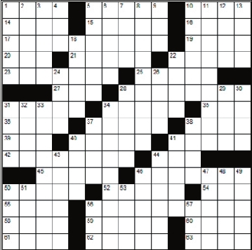 Across 1. Generous slice of the pie 5. Flooded 10. WW1 plane 14. Large luxurious car 15. Juliet’s love 16. An indefinite period 17. Ignorant 19. 500 sheets 20. Regulation (abbr.) 21. Gossip 22. Markedly masculine 23. A superior skill 25. High society 27. East southeast 28. Earthquake waves 31. A woody place 34. Alley 35. French for “water” 36. Focusing glass 37. Angler’s basket 38. Pack down 39. Commercials 40. Happy cat sounds 41. Light or tulip ones 42. A baroque musical composition 44. Point 45. Large black bird 46. In a concise manner 50. Malice 52. Cunning 54. Loving murmur 55. Square block 56. A society of women 58. So be it 59. Genuflected 60. If not 61. Zero 62. Assent 63. Rind Down 1. Impolite dinner sound 2. A protective covering 3. Spanish for “friend” 4. French for “good” 5. Stir 6. Nematodes 7. Ammunition 8. Prophetesses 9. A box for bricks or mortar 10. Layers 11. Little by little 12. Nanny 13. Audition tape 18. Not stale 22. Not yours 24. Dampens 26. Quiet time 28. Layers 29. Poetic foot 30. Dines 31. Level 32. Start over 33. Engraved 34. Putting into proper order 37. Adorable 38. Sounds of reproof40. Cover with asphalt 41. Driller 43. Series of connected ideas 44. Erase 46. Name of a book 47. French school 48. Not tight 49. Alpine call 50. Glance over 51. Mountain lion 53. End ___ 56. Calypso offshoot 57. Cool, once |