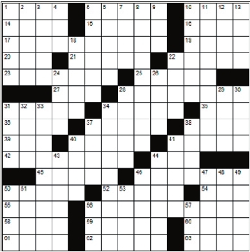 Across 1. Algonquian Indian 5. Knuckleheads 10. Flake 14. Body of a ship 15. Double-reed instruments 16. Was a passenger 17. Enthusiasm 19. Afresh 20. Altitude (abbr.) 21. Beginning 22. Notions 23. Adolescent 25. Strangely 27. N N N N 28. Ignored 31. Voting groups 34. Operatic solos 35. Australian flightless bird 36. Blockhead 37. A slippery smoothness 38. Breaststroke 39. Half of a pair 40. Groin 41. Noodles 42. Baby buggy 44. Man’s best friend 45. Dynamism 46. A communication 50. Aqualung 52. Brownish gray 54. Brassiere 55. Too 56. Triumphant 58. Religious splinter group 59. Not outer 60. 10-cent coin 61. Lock openers 62. Excrete 63. European mountain range Down 1. Swindle 2. Russian currency 3. Wash out with a solvent 4. L 5. Behavior 6. Overweight 7. Solitary 8. Geological structural features 9. South southeast 10. A baby bed 11. Winter melons 12. Bright thought 13. Church benches18. Advances (money) 22. Midmonth date 24. Make out (slang) 26. East Indian tree 28. Pee 29. Send forth 30. Russian parliament 31. Coalition 32. Roman moon goddess 33. In a burdensome manner 34. Coming down to rest 37. A cleansing agent 38. Droops 40. City in Peru 41. Show-off 43. Androids 44. Kick out 46. Deadens the sound 47. Agitated 48. Grouch 49. Relieves 50. Big bag 51. Hint 53. Skin disease 56. Compete 57. Actress Lupino |