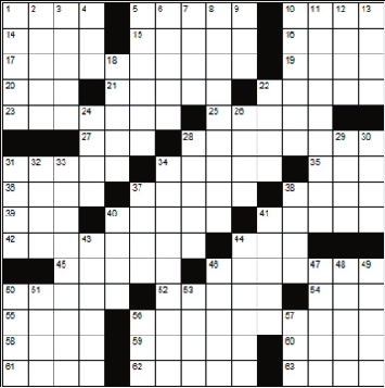 Across 1. Stooge 5. Autumn color 10. Salt Lake state 14. Dwarf buffalo 15. Sing like Bing 16. Andean country 17. Exceedingly harmful 19. Agitated state 20. Years (French) 21. Chunks 22. Outbuildings 23. Barren 25. Dialect 27. “Dig in!” 28. Brandy glasses 31. Extra 34. Anxiety 35. “The Matrix” hero 36. Benefit 37. Flower holder 38. Immediately 39. Australian bird 40. Have another go at 41. Irritates 42. Jingle 44. Flipper 45. Inexperienced 46. Curl 50. Caught a glimpse of 52. Found on old phones 54. “___ Maria” 55. Celestial bear 56. Music director 58. Decomposes 59. Loosen, as laces 60. Lairs 61. To be, in old Rome 62. Endured 63. Blind (poker) Down 1. Dads 2. Concerning 3. More bad 4. Indian bread 5. Supernatural 6. Illegal activity 7. A rigid circular band 8. In a stirring manner 9. Ensign (abbr.) 10. Gist 11. Run-down apartment houses 12. Dry 13. Shacks 18. Homeric epic 22. Sieve 24. Need a bath badly 26. Data holder 28. Tangle 29. Harvest 30. Drunkards 31. Acted like 32. Audition tape 33. Pharmacists 34. Assistant 37. Arid 38. Caroled 40. Anagram of “deer” 41. Dentist’s direction 43. Lubricating oil 44. Repleted 46. AM/FM device 47. Burdened 48. Affair 49. Breviloquent 50. Certain 51. They’re paid to play 53. Moving within 56. Public transit vehicle 57. American Dental Association |