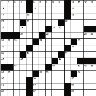 Across 1. Disabled 5. Moon of Saturn 10. Foment 14. Pitcher 15. Skyward 16. A pouch in some birds 17. Placenta 19. Daughter of Zeus and Demeter 20. Pelt 21. Gladden 22. Smelter waste 23. Splashed 25. A watery discharge 27. Make lace 28. Unlucky 31. Chocolate substitute 34. Future fungus 35. Genus of macaws 36. Again 37. Shout 38. Radar signal 39. A parcel of land 40. Moses’ brother 41. Chip dip 42. Attacker 44. Ancient unit of measure 45. Annoyed 46. Ensnarled 50. Worries 52. Skin layer 54. In a song, the loneliest number 55. Overhang 56. Likeness 58. Layer 59. Sharpshoot 60. Copied 61. Countercurrent 62. Everglades bird 63. What we sleep on Down 1. Flips (through) 2. Dreadful 3. Parisian subway 4. Before, poetically 5. Pill 6. Homeric epic 7. Legal wrong 8. Not morning 9. Greatest possible 10. Build up 11. Sport played on ice using brooms 12. Hearing organs 13. It was (contraction) 18. Rehabilitation 22. Apollo astronaut Slayton 24. Put away 26. Stringed instrument 28. Trail 29. Colored part of an eye 30. The thin fibrous bark 31. Serene 32. Dwarf buffalo 33. Fetched 34. Tearing up 37. Walk in water 38. Pow! 40. Northern diving birds 41. Egyptian peninsula 43. Blood vessel 44. Tiny village 46. Balderdash 47. Jeweler’s glass 48. Ceased 49. Accomplishments 50. Celebration 51. Police action 53. Arab chieftain 56. South southeast 57. Bar bill |