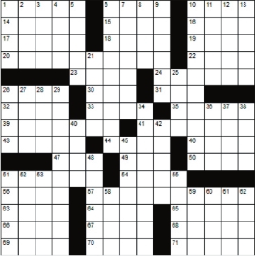Across 1. Platters 6. Give as an example 10. Happy cat sound 14. Ancient Roman magistrate 15. Air force heroes 16. Largest continent 17. Communion table 18. Popular hot beverages 19. Flows 20. Vile 22. Backside 23. Be furious 24. Slept briefly 26. Sexual assault 30. Tavern 31. L 32. Pinnacle 33. Therefore 35. Crystal-lined rock 39. A porch 41. Demean 43. Draw forth 44. Anagram of “tine” 46. Frozen 47. And so forth 49. At this time 50. Scoundrels 51. Reluctant 54. Hurried 56. Arm or leg 57. A type of biologist 63. District 64. Oceans 65. Panorama 66. Lease 67. Sea eagle 68. Arm of the sea 69. Style 70. Decays 71. Abounds Down 1. Inanimate 2. Doing nothing 3. Seats oneself 4. Applaud 5. Anagram of “fires” 6. Type of sailboat 7. One sank the Titanic 8. Blue-green 9. Ancient ascetic 10. Someone who is paralyzed 11. Take forcibly 12. Dentist’s direction 13. Leveled 21. Diced 25. Seaweed 26. Rant 27. Copied 28. Andean country 29. Make worse 34. Devilfishes 36. Killer whale 37. Perished 38. Terminates 40. Catches 42. Lumberjack 45. A very short time 48. Thurible 51. Alert 52. An small olive-grey bird 53. Make improvements 55. Lifeboat crane 58. Relating to aircraft 59. Connects two points 60. Small island 61. Flower stalk 62. Makes lace |
