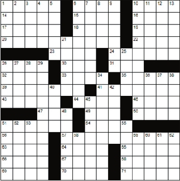 Across 1. Wharves 6. Leave in a hurry 10. Steals 14. Arm of the sea 15. Story 16. Type of sword 17. Not fresh 18. Church alcove 19. Gentle 20. Similitude 22. Dwarf buffalo 23. List of options 24. Scattered about 26. Vipers 30. L 31. Long-haired wild ox 32. Debauchee 33. Dregs 35. Indian prince 39. A type of durable wood 41. Stinking nightshade 43. Catches 44. Stigma 46. Teller of untruths 47. French for “water” 49. Lyric poem 50. L L L L 51. Goober 54. Wealthy 56. Modify 57. Dental medicine 63. Sandwich shop 64. Heap 65. Young woman 66. So be it 67. Ailments 68. Scallion 69. Stow, as cargo 70. “Oh my!” 71. Tucks away Down 1. Platter 2. Savvy about 3. Burrowing marine mollusk 4. Large brown seaweed 5. Water vapor 6. Untarnished 7. A type of pill 8. Likewise 9. Very small 10. Noteworthy 11. Express a thought 12. Under 13. four-door car 21. Bobbins 25. Mountain pool 26. Chief 27. Kind of bean 28. Young canines 29. Snakelike 34. Of questionable legality 36. Prison 37. A Freudian stage 38. Not his 40. Brother of Jacob 42. Construct 45. Whorl of petals 48. Paradise 51. Foot lever 52. Swelling under the skin 53. Suffered 55. Vagabonds 58. Pickle flavoring 59. Gave temporarily 60. Hodgepodge 61. Radiate 62. Cravings |