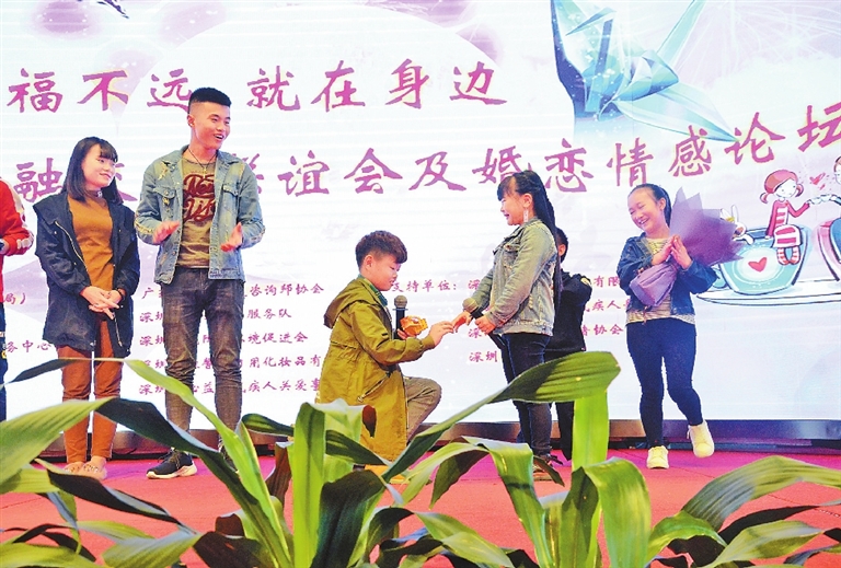 Disabled people at a gathering organized by the Futian Culture & Sports Administration in Meilin on Dec. 23, 2018. Twelve families of disabled people won the award of “Happy Families” and five couples tied the knot at the gathering.He Long