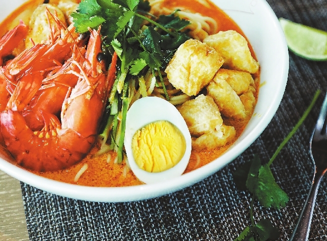 Malaysian seafood laksa is a traditional Malaysian food featuring imported seafood like shrimp and mussels. The side includes cucumber, bean sprouts, eggs and fried tofu to add more flavor and energy.