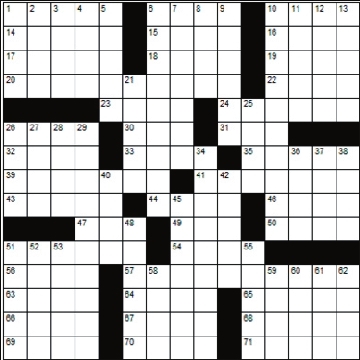 Across 1. Established 6. Cards with one symbol 10. Tale 14. Not inner 15. Awestruck 16. Margarine 17. Grave marker 18. Tall woody plant 19. A storage chest 20. Advertisement creator 22. Always 23. Couch 24. Decadent 26. Glove 30. Russian fighter 31. Mineral rock 32. Murres 33. Breezed through 35. Modify 39. Add together 41. Imitate 43. Peal 44. Wander 46. Creative work 47. Shade tree 49. To make a fool of (archaic) 50. Pause 51. Hogfish 54. Christmas season 56. Rope fiber 57. Contempt 63. Buckeye State 64. Fail to win 65. Forbidden 66. Palm starch 67. Pitcher 68. Arm joint 69. Black, in poetry 70. Cheers 71. Relaxes Down 1. Pear variety 2. Car 3. Stair 4. Evasive 5. Sketches 6. Inventor 7. Hauling 8. Type of sword 9. Record player 10. Companion 11. Quick 12. Adjust again 13. French for “our” 21. Ancient empire 25. German for “madam” 26. Mire 27. Press 28. An indefinite period 29. Bigger than a teaspoon 34. Voracious eaters 36. The thin fibrous bark 37. Decorative case 38. A musical pause 40. Ailments 42. European blackbird 45. Amazing adventure 48. Potpourri 51. Of which person 52. Rehabilitation 53. Chum 55. Banana oil, e.g. 58. Hawkeye State 59. Wan 60. Wanes 61. Codger 62. Drags |