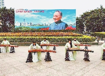 The Chinese orchestra of Shenzhen Foreign Languages School plays the Chinese zither in front of Shenzhen Grand Theater in Luohu District on March 9.