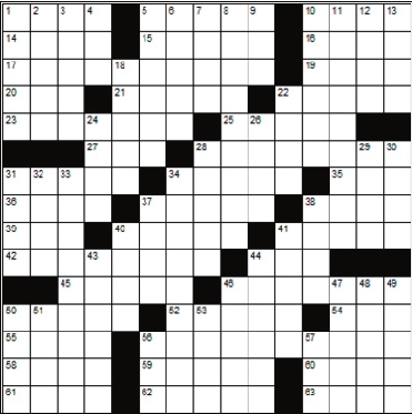 Across 1. Jazz phrase 5. Started 10. Chooses 14. Curved molding 15. Gladden 16. Average 17. A moderately quick tempo 19. Beige 20. Loving murmur 21. Keen 22. Held on tightly 23. Truthfulness 25. Pale with fright 27. Consumed food 28. Rushing 31. Accustom 34. Prankster 35. Be unwell 36. Klutz’s cry 37. Bay window 38. Killer whale 39. At this time 40. Modify 41. Howled 42. Sneaking 44. East Indian tree 45. Strength 46. Zeppelin 50. Philippine tribal chief 52. Lariat 54. Estimated time of arrival 55. Murres 56. Beggar 58. Half a quart 59. Aquatic mammal 60. Charity 61. Border 62. Anagram of “dimes” 63. An amount of medicine Down 1. Blackbeetle 2. Snow house 3. Criminal 4. Charge 5. Harangue 6. Mournful poem 7. Way in 8. Appealed 9. “The Matrix” hero 10. Egg dish 11. Monetary 12. Mountain pool 13. Cozy 18. “Beau ___” 22. Hack 24. Hearing organs 26. Essence 28. Seeking damages 29. Agreeable 30. Happy 31. Charged particles 32. Midday 33. Floating upward 34. Supply with battlements 37. Leave out 38. Trees of the genus quercus 40. Hairdo 41. Nobleman 43. Spin 44. Render harmless 46. Fire residues 47. Greetings 48. List components 49. Analyze syntactically 50. Hoodwink 51. Desiccated 53. Against 56. Detachable container 57. Daddy |