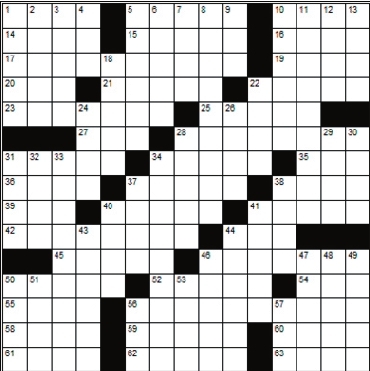 Across 1. As a result 5. Satisfies 10. Cod or halibut 14. Length of yarn 15. Long stories 16. Ancient Peruvian 17. Squadron 19. Russian emperor 20. Faster than light 21. Busybody 22. Ere 23. Swarming 25. Tycoon 27. Half of a pair 28. Shoulder boards 31. Confuse 34. Adhesive 35. Prefix meaning “modern” 36. Reclined 37. City in France 38. Leave in a hurry 39. American sign language 40. Clique 41. Periods of seven days 42. A flower of the lily family 44. Tavern 45. Devilfish 46. Sasquatch 50. Office worker 52. Not tight 54. Mineral rock 55. Sharpen 56. Fellow citizen 58. Does something 59. Show-off 60. Chooses 61. Throw 62. Foreword 63. “Whoopee!” Down 1. Larceny 2. Urgency 3. Parental brother 4. Calypso offshoot 5. Calm 6. Mimicking 7. Lean 8. Toxemia of pregnancy 9. South southeast 10. Off-and-on 11. Impertinence 12. Stigma 13. Rabbit 18. Slowly losing life 22. Chills and fever 24. Natural satellite 26. Horse feed 28. Our planet 29. Heavy, durable furniture wood 30. Drunkards 31. Ho-hum 32. Not difficult 33. Thin wires 34. Trousers 37. Kick 38. Slave 40. To move quickly 41. Bet 43. Gentle stroke 44. Casual eatery 46. Silly mistake 47. Dynamism 48. Give a speech 49. Anxious 50. Gossip 51. Mentally irregular (slang) 53. Dethrone 56. Consumer price index 57. Ouch! |