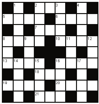 Across 2. Large passenger vehicle 5. Singing threesome 6. Cart away 7. “___, what, where, when, why,” 8. Shout 10. Last ___ and testament 13. Pout 16. Jump rope 18. Target towards a goal 19. Upper limbs 20. Secondhand 21. Yank Down 1. Strongly encourage 2. Cereal dish 3. Reveal 4. Twist in spirals 8. Sweet potato 9. Part of a mouth 11. Writing liquid 12. Slice off 14. Shrek, for example 15. Not west 16. Self-satisfied 17. New thought |
