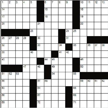 Across 1. Flat circular plates 6. A ball of yarn 10. Bum around 14. Arm of the sea 15. Magma 16. Bright thought 17. Attendance counter 18. Twixt 19. Tomcats 20. Harmonious 22. Not there 23. Tibetan monk 24. Rite 26. Chooses 30. Unhappy 31. Comes after Mi and Fa 32. Agitate 33. Catch 35. Offensively curious 39. Agueweed 41. Mollify 43. Piece of paper 44. Bristle 46. An aquatic bird 47. A sizeable hole 49. Mesh 50. Concludes 51. Environment 54. Masticate 56. Ends a prayer 57. Stinky 63. Anger 64. Two-toed sloth 65. Wavelike design 66. Auspices 67. Not a win 68. Protrusion 69. Collections 70. Adhesive strip 71. Infections of the eye Down 1. Platter 2. Within 3. Slender 4. Large brown seaweed 5. Pilfer 6. Applicants 7. A fast Brazilian dance 8. Wicked 9. Waterproof hip boots 10. A warning beacon 11. French farewell 12. Striped equine 13. Artist’s workstand 21. Thigh armor 25. Charged particles 26. Spheres 27. Milne bear 28. Prong 29. Drowsiness 34. Gatekeeper’s residence 36. Wood that is cut 37. Quaint outburst 38. Cravings 40. Anagram of “ties” 42. Filled to excess 45. Embrace 48. Commotion 51. Female horses 52. Picture 53. On the up and up 55. Uteri 58. Dwarf buffalo 59. Defeat decisively 60. Greasy 61. Desire 62. Views |