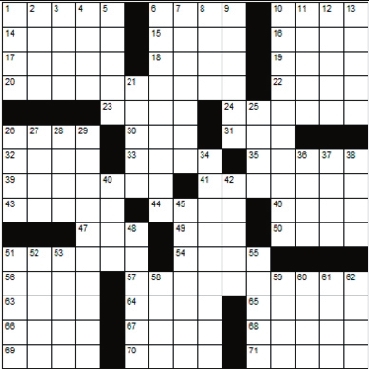 Across 1. Law and _____ 6. Unit of land 10. Wings 14. Ganders 15. Godsend 16. Ancient marketplaces 17. Inclined 18. Traveled through water 19. Fastens 20. Produce 22. Sea eagle 23. German for “mister” 24. Disseminate 26. Strip of wood 30. Affix 31. In what way 32. Dogfish 33. A young lady 35. Third Greek letter 39. Rant 41. Smelly 43. Coil of yarn 44. Not mine 46. Twilight 47. Foot digit 49. Consumed food 50. Collections 51. Prolific 54. Defrost 56. Shade of blue 57. Long past 63. Ringlet 64. Layer 65. Gnatlike insect 66. A dog wags one 67. By mouth 68. Sheep sound 69. Kill 70. Depend 71. American retailer Down 1. Leer at 2. Coral barrier 3. Unhearing 4. Feudal worker 5. Barf 6. Paradox 7. Fearful people 8. Defeat decisively 9. Catch in a net 10. Later 11. France’s longest river 12. Sporting venue 13. Alleviated 21. League members 25. Jump up and down 26. Laboratories 27. Rabid 28. An indefinite period 29. According to custom 34. From the south 36. Pout 37. Be compelled 38. Questions 40. Soon 42. Nightmare 45. Porridge 48. Anagram of “rioted” 51. Truths 52. Identical 53. Papal court 55. Uteri 58. Bog 59. Anger 60. Bright thought 61. Food thickener 62. Permits |