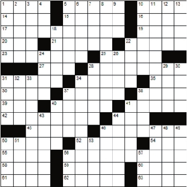Across 1. The thin fibrous bark 5. Ere 10. Every single one 14. By mouth 15. The general activity of selling 16. Hawaiian feast 17. Never-ceasing 19. Doing nothing 20. Years (French) 21. Fabulist 22. Angles of a branch or leaf 23. Not functioning properly 25. Course around a planet 27. A large vase 28. Expressive of contempt 31. Chip dip 34. Center 35. Petroleum 36. “What a shame!” 37. Anagram of “debit” 38. A single time 39. Some people chew this 40. Melded 41. A friction match 42. Green gems 44. Record (abbr.) 45. Fictional deer 46. Ways of doing things 50. Lofty nest 52. Hemp 54. New Zealand parrot 55. Feathery scarves 56. Masochist 58. French cheese 59. Ledges 60. Church alcove 61. Transmit 62. Anagram of “aside” 63. Desserts Down 1. Synagogue scroll 2. Drome 3. A condition marked by tremors 4. Beer 5. To the rear 6. Not true 7. Margarine 8. Answered 9. S 10. Magical drink 11. Tryouts 12. Phone 13. Colors 18. Nigerian monetary unit 22. Assist in crime 24. Wimp 26. A musical pause 28. Factions 29. Agreeable 30. Delight 31. Wise one 32. Astringent 33. Doofus 34. Phoned a wrong number 37. Electric light 38. Ow! 40. Notability 41. Relating to a fetus 43. Lifted 44. Break time 46. Lava 47. Relative of a giraffe 48. Compacted 49. Satisfies 50. Wanes 51. Bygone era 53. Exposed 56. A law enforcement agency 57. One time around |