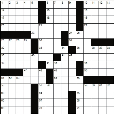 Across 1. Browned bread 6. Constellation bear 10. Nobleman 14. Come from behind 15. Catches 16. Hawaiian feast 17. Fragrant oil 18. Coagulate 19. Goddess of discord 20. Picture 22. Actors in a show 23. Notch 24. A haphazard assortment 26. Peddle 30. Female sheep 31. Stir 32. Double-reed woodwind 33. Contributes 35. Angry 39. “Darn it!” 41. Coach 43. Muzzle 44. Sketch 46. Adolescent 47. Central 49. Santa’s helper 50. Existence 51. Selection 54. Dour 56. Trumpet 57. In a non-hurting manner 63. Therefore 64. Citrus fruit 65. Female demon 66. Brother of Jacob 67. Poems 68. A group of soldiers 69. Knows 70. Cravings 71. Indications Down 1. Snare 2. Pledge 3. Countertenor 4. Thin strip 5. Beginners 6. Having sufficient room 7. Connected by kinship 8. Cease 9. A breathing disorder 10. Voters 11. Hearing-related 12. Lift 13. Vigorously passionate 21. Gather 25. Norse god 26. Mats of grass 27. Black, in poetry 28. Corporate image 29. Legume-like 34. Littleness 36. Anagram of “sage” 37. T T T T 38. Sea eagle 40. Ear-related 42. Horrible 45. A systematic plan for therapy 48. Position 51. Impudence 52. Cowboy’s best friend 53. Keyboard instrument 55. Thaws 58. Adjutant 59. Indian dress 60. Dirty air 61. King of the jungle 62. Blabs |