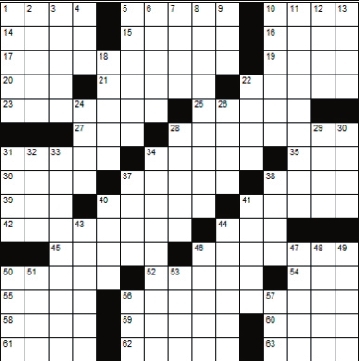 Across 1. Not yours 5. Flooded 10. The bulk 14. Wildebeests 15. Hindu social division 16. Anagram of “rave” 17. Freeing 19. Roman emperor 20. French for “summer” 21. Sea 22. Broadcast 23. Hopelessness 25. Panache 27. Historic period 28. Exchanges 31. Couches 34. Ancient Athenian philosopher 35. Type of whiskey 36. Nights before 37. Weepy 38. Cajole 39. Hearing organ 40. Move very slightly 41. Chatty 42. Inert medications 44. Dawn goddess 45. Inexpensive 46. Esoteric spiritual knowledge 50. Assumed name 52. Stops 54. Before, poetically 55. Hireling 56. Front man 58. Cozy 59. Winged 60. Initial wager 61. To be, in old Rome 62. Brusque 63. Colors Down 1. Leered 2. Come together 3. Yokels 4. South southeast 5. Sweet wattle 6. H2O 7. Largest continent 8. Ceramic ware 9. Female chicken 10. Lunatic 11. Subvert 12. Arid 13. Stepped 18. Lion sounds 22. Countertenor 24. Legumes 26. Large town 28. Drosses 29. Nestling hawk 30. Alluring 31. Dribble 32. Egg-shaped 33. Prolific or fruitful 34. A type of pervert 37. Brass instrument 38. To tax or access 40. Honey insects 41. Hangman’s knot 43. Alter 44. Main course 46. Surpluses 47. Little 48. Angry 49. Yields 50. Church alcove 51. Focusing glass 53. Food thickener 56. Not thin 57. Possessed |