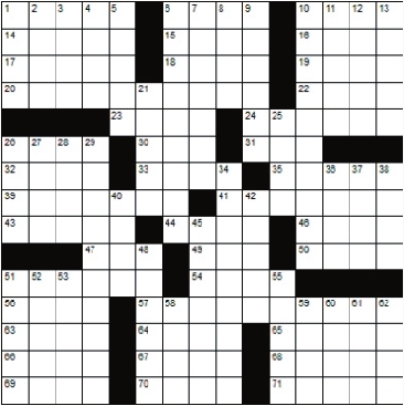 Across 1. Half of six 6. Not Mama 10. French for “state” 14. Lion sounds 15. Quiet time 16. Desire 17. Anxiety 18. District 19. Maize 20. Days gone by 22. Away from the wind 23. Indian music 24. Hammer 26. Human creativity 30. Smidgen 31. Timid 32. Protective ditch 33. Beer 35. Chose 39. Jeopardize 41. Whenever 43. 3-banded armadillo 44. Arid 46. Murres 47. Ensign (abbr.) 49. “Eureka!” 50. Slave 51. Brave 54. Ripped 56. Border 57. Huskiness 63. Conservative 64. Spheres 65. An small olive-grey bird 66. Applaud 67. Leer at 68. Make into law 69. Fit 70. Caustics 71. Relaxes Down 1. Found in a cafeteria 2. Sharpen 3. Tatters 4. At one time (archaic) 5. Banana oil, e.g. 6. Women pleasure-seekers 7. Golden 8. Entreaty 9. Warning devices 10. Mallee 11. Fairy tale character 12. Yes 13. Basic belief 21. Jewish scholar 25. Greeting at sea 26. Dogfish 27. Cavort 28. The thin fibrous bark 29. Mental representation 34. Veterans 36. Rubber wheel 37. Arab chieftain 38. Unhearing 40. Hindu princess 42. Approaches 45. Palatable 48. Place of learning 51. Emerge from eggs 52. African virus 53. Not urban 55. Not a single time 58. Unrestrained revelry 59. 1 less than 10 60. Historical periods 61. Religious offshoot 62. Drunkards |