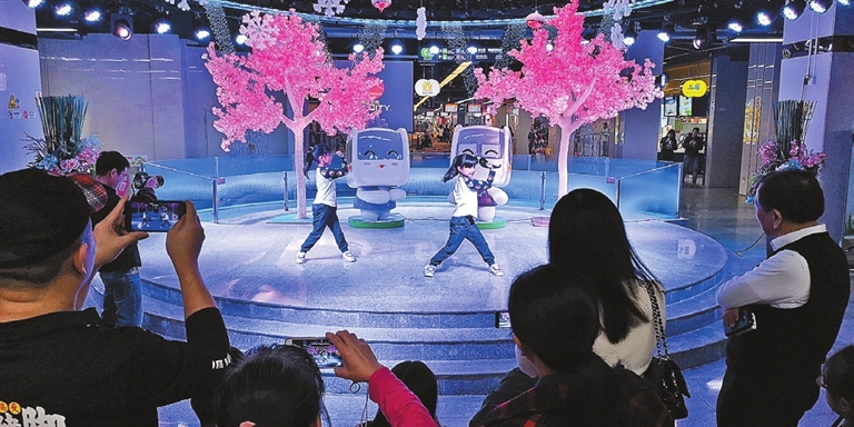 Children dance on a stage inside a mall in Futian CBD decorated for Christmas. The interactive decorations react to their dancing.