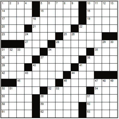 Across 1. Gentlewoman 5. Slats 10. Branchlet 14. District 15. Chills and fever 16. Gown 17. Harmonious 19. Send forth 20. Australian bird 21. Prison-related 22. Compile 23. Idol 25. A Great Lake 27. Eastern Standard Time 28. Nose holes 31. Nascence 34. Stilts 35. Menagerie 36. Burden 37. Pondered 38. A feat 39. Play a role 40. Parts portrayed 41. Small open pies 42. Reorganizes 44. Soak 45. Moisten 46. Attentive 50. Muse of love poetry 52. Pointed arch 54. Half of a pair 55. Jump up and down 56. Self-control 58. Distinctive flair 59. Potato state 60. Celebrity 61. If not 62. Daisylike bloom 63. Catch a glimpse of Down 1. Twined 2. Bouquet 3. Take exception to 4. Chatter 5. Potential 6. Growing old 7. Brass instrument 8. Places of pain and turmoil 9. South southeast 10. Quake 11. Philanderer 12. Nile bird 13. Obtains 18. Gorillalike 22. Human creativity 24. Permits 26. Utilized 28. Snouts 29. Misplaced 30. Drunkards 31. Feathery scarves 32. 1/12th of a foot 33. Yellow turnips 34. Softwoods 37. Pout 38. A measuring instrument 40. Start over 41. Keepsake 43. A type of organic compound 44. Redeemer 46. Strong flexible twig 47. Typefaces 48. Open, as a bottle 49. Apprehensive 50. Type of sword 51. Somersault 53. Annoying insect 56. Spy agency 57. East-southeast |
