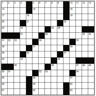 Across 1. Farm equipment 5. Not smooth in texture 10. Smack 14. Winglike 15. Habituate 16. Tropical tuber 17. Sore throat 19. Backside 20. An uncle 21. Consumed 22. Feel 23. They love to inflict pain 25. Batman is The _____ Crusader 27. Consumed food 28. Scar 31. Stalks 34. Pontiffs 35. Mistake 36. Grave 37. Wood nymph 38. Largest continent 39. Sphere 40. Fairy tale character 41. Impudent girl 42. Prognostication 44. Point 45. Feudal lord 46. European wild oxen 50. Close-knit group 52. Seminal fluid 54. Point 55. Region 56. Apparent 58. Pepper____ 59. Discovered 60. Mobile phone 61. Lack of difficulty 62. Hackneyed 63. At one time (archaic) Down 1. Loses color 2. Andean animal 3. Rowed 4. Ironic 5. Emissary 6. Pieces 7. Speechless 8. School administrator 9. Aye 10. Avenue 11. Washerwoman 12. Not legs 13. Bishop of Rome 18. Homes for birds 22. Resorts 24. Poetic foot 26. Breezed through 28. Demurely 29. Colored part of an eye 30. Roentgen ray 31. Cease 32. Unit of pressure 33. Heartens 34. Computing device 37. Remnant 38. Car 40. You (archaic) 41. Brass musical instruments 43. Buccaneer 44. Charisma 46. Catkin 47. A heavy wooden pole 48. Small mountains 49. Refine metal 50. Arrived 51. Operatic solo 53. Decorative case 56. Frequently, in poetry 57. Frozen water |