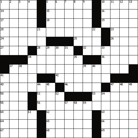 Across 1. Strange sightings 5. Exodus plague 10. Litmus-paper reactant 14. Needing liniment 15. It’s noble and a gas! 16. County in the Sunshine State 17. Toward the sheltered side 18. Gymnastically inclined 19. Egyptian deity 20. Aptly named evangelist 23. Trains on high 24. Rodeo necessity 25. Rap sheet letters 26. Ka ___ (southernmost Hawaiian point) 27. Palindrome center 28. Stamp on steak 32. Runs a refinery 34. Samantha’s mother 36. Scuttlebutt 37. Russell-Grant comedy 41. Confined (with ‘’up’’) 42. Is worthy of 43. Word of preference 46. Does lawn work 47. Seasonal mall employee 50. Plaint for ‘’Billie Joe’’ 51. Pal of Pooh 53. Dean’s 1955 co-star 55. Prohibit 56. Rolling Stones classic 60. Part of a breakout 62. Swarms 63. Conga formation 64. Comparison word 65. First name in cosmetics 66. At all 67. Sushi choices 68. Bridle straps 69. Spreads hay Down 1. Suited for the purpose 2. Pertaining to leaves 3. Threatening option 4. Sews up the eyelids of falcons 5. Titles for monks 6. Prego competitor 7. Husband of Frigg 8. First name among Israeli PMs 9. Goes furtively 10. Byron’s daughter 11. Roselike flower 12. Worship of graven images 13. Most compact 21. Juvenescent 22. Edible tuber 29. Star Wars abbr 30. Coed’s digs 31. City northwest of Marseilles 33. Byrnes and Roush 34. Bk. before Job 35. Cornrows alternative 37. Cephalalgia 38. Like some organs 39. Free (of) 40. Self-identifying response 41. Court where last words are heard 44. Slip up 45. Woodshop tool 47. Salad plant 48. Tilted 49. Anterooms 52. Past plump 54. Tiny land mass 57. Legend of the Himalayas 58. IRS agents 59. Applications 61. Print widths |