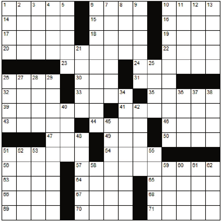 Across 1. Imperial 6. Fabricated 10. Scoundrels 14. Draw forth 15. Rectum 16. Portent 17. Skin layer 18. Caustics 19. Competent 20. Apparent 22. Transfer possession 23. Meal in a shell 24. Spay 26. 50 percent 30. Cover 31. L 32. Curved molding 33. Kind of bean 35. Expire 39. Brassiere 41. Enduring 43. Law and _____ 44. Drunkards 46. Decorative case 47. Caviar 49. Cook in hot oil 50. Applies lightly 51. Entranced 54. Gas or petrol 56. Notch 57. Dwelling 63. Indian dress 64. Frosts 65. Japanese stick fighting 66. Cocoyam 67. Study hard 68. Finally (French) 69. Adolescent 70. Collections 71. Rock Down 1. Start over 2. Poems 3. Mongol hut 4. Tip 5. Inclined 6. Malevolent 7. Any person 8. Affaire d’honneur 9. Ancient ascetic 10. Changed into a solid mass 11. Scope 12. Look closely 13. Contemptuous look 21. Chip dip 25. L L L L 26. Vagabond 27. Food thickener 28. Extend credit 29. A group of organizations 34. The qualities of unselfish concern 36. Falafel bread 37. Give the cold shoulder 38. Auspices 40. God of love 42. Heretofore (2 words) 45. Quirky 48. Morals 51. Something of value 52. Clearing 53. Mob 55. Bodies of water 58. Unit of land 59. Canvas dwelling 60. Data 61. Norse god 62. Not a single one |