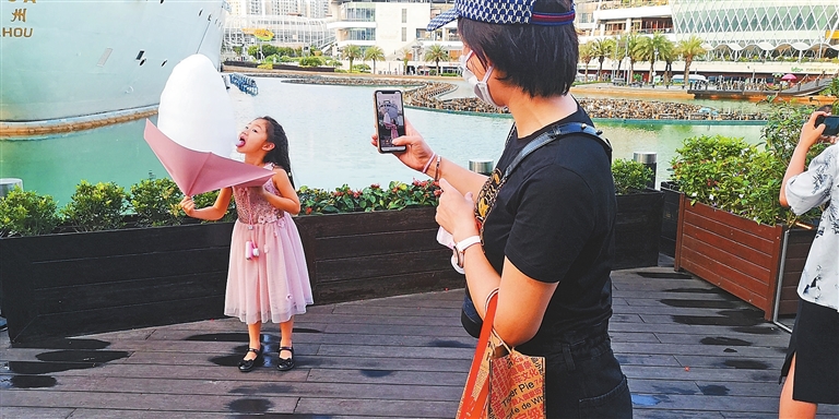 A child takes a photo beside Minghua Ship, Sea World in Shekou. Sea World has become a popular place for children to enjoy sea view and snacks during weekends.