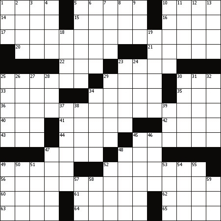 Across 1. Word with who, what or where 5. Subdued 10. Pump, e.g. 14. Completely convinced 15. Model’s asset 16. Grabbed by force 17. “Smoking hasn’t affected me a bit . . .’’ 20. Basis of reasoning 21. Lightens the load 22. Choice words? 23. Iron attachment 25. Thunderstruck 29. Serb or Croat, e.g. 30. War stat 33. Loathsome one 34. Nonchalant 35. Auberge 36. “Hand me that fly swatter . . .’’ 40. Lemon addition 41. Polly and Rhody 42. “The Magic Mountain’’ locale 43. Abe’s son 44. ___ ex machina 45. Loss of the certifiable 47. Be nostalgic for 48. That lady yonder 49. Poker phrase 52. Prevent from being seen 56. “Let’s see your swan dive . . .’’ 60. Sacrum or radius 61. Place for a Chicago touchdown? 62. Kind of pool 63. City north of Des Moines 64. Zephyrs, e.g. 65. Carangid fish Down 1. Computer key 2. Closed circuit 3. Talk like a toper 4. Drop-off spot 5. Casual garment 6. Accrue 7. They might squeak by 8. Antlered critter 9. Morning deposit 10. Home extension 11. Tills the soil 12. Flow oh so slowly 13. ___ out (barely gets) 18. Med. insurance groups 19. Billows 23. Where one makes the grade 24. Secure with cord 25. Casey was here 26. Mild Holland cheese 27. Terrorized pledges, in a way 28. Wood-shaping tool 29. Taj Mahal attractions? 30. Vanilli’s partner 31. Unfitting 32. Fidgety 34. Additional remuneration 37. Kind of pool 38. Spectrum bands 39. No-star review 45. Common, horse and sixth 46. Spot for a keystone 47. Lode abodes 48. Hidden cache 49. Benny and three others 50. Hover threateningly 51. Script unit 52. Family group 53. Roe 54. Baldwin or Waugh 55. Russian spacecraft series 57. Farm mother 58. Upsilon follower 59. River bottom |