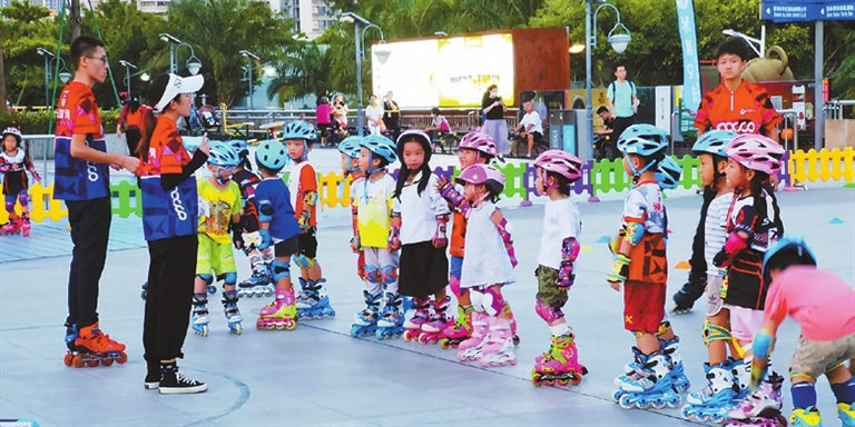 Children prepare to have skidding lessons at Bao’an Stadium. Skidding, swimming and dancing are the most popular sports during the summer vacation.