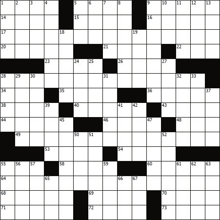 Across 1. She had a “Tootsie’’ role 5. Freeze front 9. One who keeps things kosher 14. “Permit Me Voyage’’ author James 15. Mother of Levi and Judah 16. Sweater synthetic 17. STEP OUT 20. Included afterward 21. He’s number one 22. Pursue with passion 23. Biologist’s medium 26. Lobster serving 28. STEP IN 34. Words with roll or tear 35. Check for letters? 36. Electric surge 38. Entrance for Clementine’s dad 40. Not rinsed, perhaps 43. One type of poll 44. Administered medicine 46. Pistol projectile 48. Hudson Bay prov. 49. STEP UP 53. Luminous topper 54. Warm, in searches 55. Tour operator 58. Hindu royal 60. Cockatoo’s pride 64. STEP DOWN 68. Bridge bid, briefly 69. Pelvic bones 70. Part of a makeshift swing, perhaps 71. What a witness may take 72. Be dependent 73. Fit to finish? Down 1. Festive fete 2. Made cheddar better 3. Librarian’s urging 4. Bring to light 5. Cat fancier from Melmac 6. Word form for “recent’’ 7. Butler’s quarters? 8. “There was no other choice for me!’’ 9. Co-renters, slangily 10. Extension 11. Squandered, as a lead 12. Chastity, for one 13. Eagerly studying 18. Prize for a mystery 19. Polite contraction 24. Ones of a kind? 25. City near Lake Tahoe 27. Bounding gait 28. The recently fired hit it 29. Words with “the line’’ or “an era’’ 30. Rupee part 31. Store secretly 32. Watergate figure 33. Barely making (with “out’’) 37. Kitchen extension? 39. Word in many college names 41. It may be hatched 42. Type of log 45. 1996 Greg Kinnear film 47. Candied, in cookery 50. Rickman of “Galaxy Quest’’ 51. Nicolas Cage film of ‘9752. Novel flubs 55. Advantages 56. Polite bloke 57. In midvoyage 59. Cruise stopover, perhaps 61. Shorten to fit, perhaps 62. Parched 63. Place for a knot 65. Setting for “Newhart’’ 66. Feel unwell 67. Hen’s task |