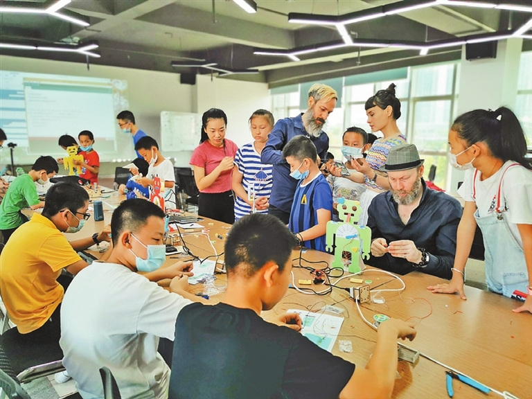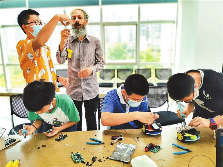 Chen Xiaochun 654789759@qq.com A robot maker workshop for youth, a science program taught in English, was held recently at the Bao’an Science & Technology Hall. The event was hosted by the Science, Technology and Innovation Bureau of Bao’an District and organized by the Bao’an Foreign Languages Association. The workshop, guided by a seven-expert group of Bao’an Foreign Languages Association members, was an interactive activity aimed at enhancing the technological literacy of youth in Bao’an District. The content included basic artificial intelligence programming and robot making. Both Chinese teachers and expat teachers worked together in the workshop to provide a bilingual environment. Most participants were senior-grade primary students and junior high school students who have a good English foundation. All together there were around 100 students participating in the workshop. The month-long workshop had four phases with different themes including competition robots, wearable devices, fashion technology and time management devices. Under the guidance of the teachers, the students built four unconventional robots and electronic kits. At the end of the workshop, there was a robot competition. During the last week, some young expat students were invited to audit the classes, providing another chance of inter-cultural exchange. |