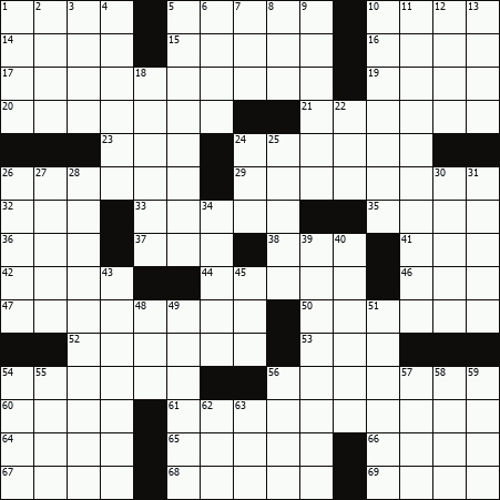 Across 1. Safe ball 5. Intellectual complexity 10. Hole punchers 14. Switch attachment? 15. Irregularly notched 16. Hip 17. Printing process 19. Timbre 20. “Georgy Girl” group (with “The”) 21. Caught in the act 23. Yachter’s heading, perhaps 24. Not digital 26. Gordon in “Oklahoma!” 29. Application request 32. Nigerian native (Var.) 33. Part of a holiday phrase 35. Telephone button 36. Point to be made? 37. Half a figure eight 38. “___ Gratia Artis” (MGM motto) 41. Show love, in a way 42. Sciences counterpart 44. Renter’s sign 46. Ancient Tokyo 47. Journey interruption 50. Rabbit hunter 52. City on the Loire 53. Heroine of “Die Meistersinger von Nurnberg” 54. Corpus front 56. Utilized Lego blocks 60. Fired ruthlessly 61. Blue items, in song 64. Field rodent 65. Foix floor 66. Proof word 67. ___’acte (intermission) 68. ___ and penates 69. With a discount of Down 1. Sweet ending 2. ___ Lackawanna Railroad 3. You’ll get credit for it 4. Sopwith Camel contemporary 5. They lay down the law 6. Stumbles or bumbles 7. Mystery man? 8. “Murder in the Cathedral” monogram 9. Some hair dyes 10. They speak louder than words 11. Daydream 12. Unparalleled 13. Pung, e.g. 18. House companion 22. Computer keyboard key 24. Part of a recipe phrase 25. Brazilian seaport 26. One with a golden touch 27. Call off 28. Alabama, Georgia, Arkansas, etc. 30. Norman Lear show 31. Cereal eater? 34. Chemist’s compound 39. Separates boxers 40. Canyon and Allen 43. One in the left lane, typically 45. Choice conjunctions 48. Avis output 49. Container 51. Biblical matriarch 54. Fortunate one? 55. Nerve part 56. Falling-off point 57. Barreled along 58. Brain test results, for short 59. Brit. decorations 62. Tony winner Hagen 63. Musical aptitude |