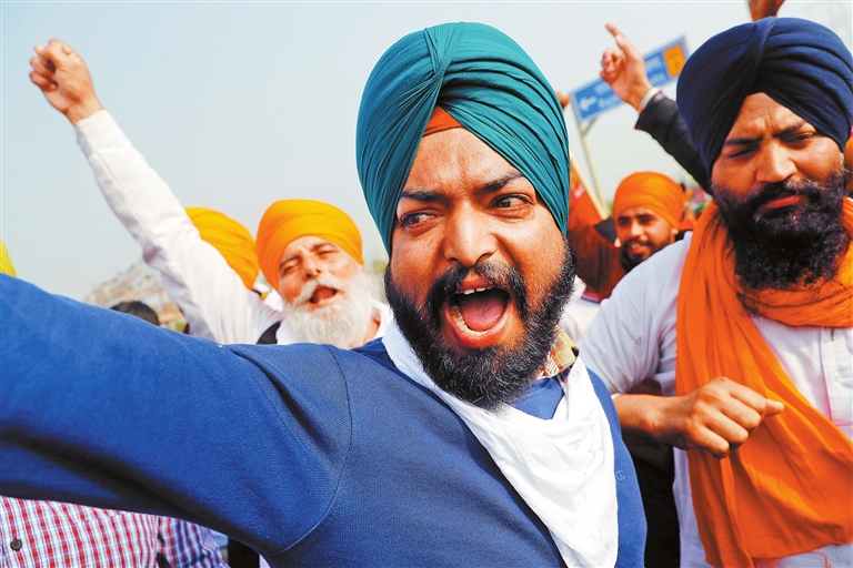 Farmers shout slogans at a protest site during a nationwide strike against the newly passed farm bills at the Delhi-Uttar Pradesh border in Ghaziabad, India, yesterday. India’s government on Saturday failed to break a deadlock with farmers protesting over agricultural reforms and will meet again today, the agriculture minister and union leaders said.SD-Agencies