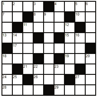 Across 1. Autumn 4. Very dry 7. Note after so 8. Eastern Standard Time 10. That is 11. Cut into cubes 13. Sheep sound 15. Belonging to us 17. Children’s book author 18. Female deer 19. Snake-like fish 21. 10 cent coins 24. Advertisement 26. Chemical in Aspirin 27. Intravenous (abbr.) 28. Not hot or cold 29. Melody Down 1. Bungle 2. Battery size 3. Flowery necklace 4. Had eaten 5. Roman 2 6. Honey, sweetheart 9. Yells 11. Challenged 12. Quantities of medicine 14. Ruckus 16. Utilise 18. Sketch 20. Strong affection 22. _ __; you are; he is 23. Consume food 25. Father 27. Within |