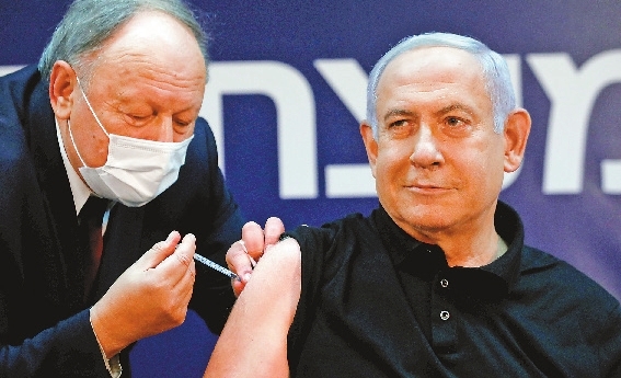 Israeli Prime Minister Benjamin Netanyahu receives a COVID-19 vaccine at Sheba Medical Center in Ramat Gan, Israel, on Saturday. Israel launched on Sunday its COVID-19 inoculation drive. Health workers were the first to get the shots in the campaign that aims at vaccinating about 60,000 people per day, the Israeli Prime Minister’s Office and the health ministry said.SD-Agencies