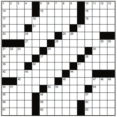 Across 1. Eve’s opposite 5. Dreadful 10. Copied 14. Chills and fever 15. Lustrous 16. Fleet 17. A superficial person 19. District 20. Avenue (abbr.) 21. King 22. African antelope 23. Intercede 25. Moses’ brother 27. Coloring agent 28. Termagants 31. Relieves 34. Openings 35. Actress Lupino 36. Damson 37. Repairs 38. Be unsuccessful 39. Belief 40. Surged 41. “Beau ___” 42. Added together 44. Put clothing on 45. Sound 46. Blank 50. Small and pulpy edible fruit 52. Corrupt 54. Lyric poem 55. Den 56. Miss 58. Ricelike pasta 59. Any animal with no feet 60. Slip 61. A ball of yarn 62. Faked out an opponent 63. Checks Down 1. Gentlewoman 2. Pointed arch 3. Governed 4. Born as 5. Keen 6. Cetacean mammal 7. Satisfactory 8. Beginner 9. Alkaline liquid 10. Not digital 11. Psychoses 12. Not odd 13. Twosome 18. Meal carriers 22. Historical periods 24. As just mentioned 26. The products of human creativity 28. Pestered 29. Modify 30. A period of discounted prices 31. Sweeping story 32. As well 33. Create an abstract 34. Video storage medium 37. French for finished or done 38. Ward (off) 40. Neat 41. Nannies and billies 43. Rabbit warren 44. Turned down 46. Thermionic tube 47. A type of dance 48. Improvise 49. Requires 50. Coalition 51. Nobleman 53. Rabid 56. Dada 57. Eastern Standard Time |
