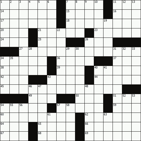 Across 1. Beyond what’s expected 7. Moms in wool coats 11. Welcome guest at Thanksgiving? 14. Instrument for Michelangelo 15. Seedy joint 16. Inst. founded by Jefferson 17. Malicious fabrication 18. Big winner of 1967 20. Certain URL ending 21. Joel Grey, in “Cabaret” 23. Soccer objectives 24. NBA center Ming 25. Slangy refusal 26. “Ad astra ___ aspera”’ (Kansas motto) 27. Big loser of 1588 34. Like some communities 36. Reaction to bad news 37. Mood brightener 38. Chalcedony 39. Certain URL ending 40. Line drawer of 1767 42. Capek play 43. Big bore 44. Liqueur flavoring 45. Summer attire 49. The first cardinal 50. Angle attachment? 51. Toy with a string 54. Like some committees 57. Israeli military leader 59. Darth Vader, as a boy 60. Nineties megaband 62. C.S. Lewis’ magical world 64. Seasonal helper 65. “Sesame Street” favorite 66. Connecticut submarine base site 67. Rest 68. Pieces of solid food for dipping 69. Refuses drugs? Down 1. Real man? 2. Mitchell’s belle 3. Sixties idol 4. Pamplona pronoun 5. Under-the-window performance 6. Hemingway sea-goer 7. Slight advantage 8. Hook up electronically 9. Rapper with a self-named sitcom 10. “If I Had a Hammer” songwriter 11. Orchestral heavyweight 12. Football-shaped 13. Giant among sluggers? 19. Testing standard 22. Foolish fancy 26. Goatish god 28. Canoodle 29. They’re often canned 30. Stuck-up 31. Support staff 32. Harmonizing minimums 33. George I’s predecessor 34. Glad rags 35. Feverish fit 40. Tortellini topping, often 41. Exterminator’s target, perhaps 43. Presidential monogram 46. Marshy expanse 47. Sam and Ben 48. Certain Borneo denizens, briefly 52. The beginning of each theme entry is one 53. Clavichord’s descendant 54. Anthropoids 55. A hero may be on display here 56. Sword handle 57. Humid 58. Biblical prophet 61. Selena portrayer, to fans 63. First name among the “Hee Haw” cast |