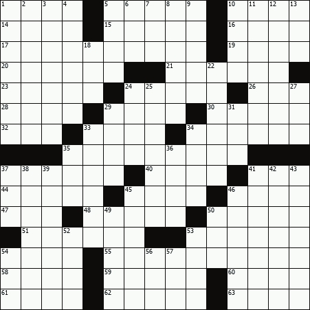 Across 1. Nice word to see on a bill 5. Dummkopfs 10. Charitable offerings 14. Teen outbreak 15. Unwelcome kitchen visitor 16. Partiality 17. Seafood entree 19. Small soldiers 20. Dined at the diner 21. Ring follower 23. Negative stipulations 24. Expression of displeasure 26. Letters of assent 28. Cognizant of 29. Just one of those things? 30. Cum laude modifier 32. Makes one’s mark? 33. Leisurely pace 34. Obscurer of trees, for some 35. It’s served at some dinners 37. More than whimper 40. Word with kill or hog 41. Glutton 44. English racetrack town 45. Saucy 46. Train sound syllable 47. Equine mother 48. Chipmunk snack 50. Wonder Woman alias 51. Commercial attache 53. Sight in the west 54. Be revolting? 55. Type of salad dressing 58. Mayberry tippler 59. Central artery 60. Pointing devices 61. Computer game set in an island world 62. Forty-___ (prospector) 63. Years in Madrid Down 1. Contradiction in terms 2. Paint solvent 3. Starts a paragraph, in a way 4. Explorer Hernando 5. Unruly tyke 6. Alley-___ 7. Use a microwave on 8. Yellow and black cat 9. Shakespearean title character 10. Having ___ hair day 11. Family tree 12. Dowagers 13. Leaky radiator sound 18. Xi preceders 22. California nut 24. Ounce of liquor 25. One at a wedding reception 27. Krazy of the comics 29. Quartet minus one 31. “___ we there yet?” 33. Wendy’s founder 34. Royal decree 35. Reporter’s question 36. Threadbare 37. It’s made daily 38. Lack of transparency 39. One way to learn by 41. Introduce gradually 42. “The Bald Soprano” playwright 43. Small, pointed beards 45. Hoi follower 46. Fellini’s medium 49. Castro, for one 50. “Well, that’s obvious!” 52. Tree house 53. An unwanted lasting impression 54. CD-___ 56. Keats subject 57. Summer along the Seine |