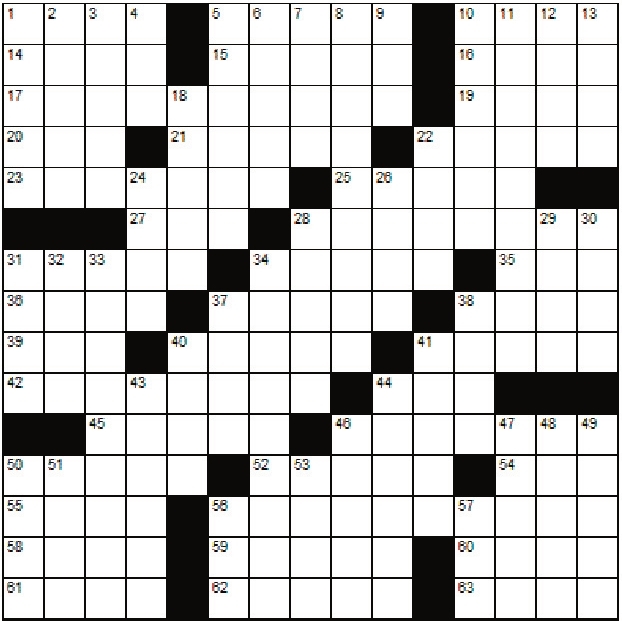 Across 1. Box 5. Be in trouble with 10. Snip 14. Scrabble piece 15. Cent 16. Start over 17. Precision 19. Matured 20. Direction 21. Lift 22. False front 23. Large spotted feline 25. Originates in 27. Frozen 28. Unsuitable match 31. Large long-necked wading bird 34. Bottle stoppers 35. Caviar 36. Laboratories 37. Footwear 38. Corridor 39. In the past 40. African antelope 41. Reef material 42. Sunshades 44. Type of snake 45. Drive forward 46. Welcome mat 50. An evil spirit 52. Habituate 54. Anagram of “Ail” 55. Analogous 56. Showy bloom 58. Territory 59. Swift 60. Dirty air 61. Colors 62. Put off 63. Not in danger Down 1. Pilfer 2. Sprite 3. San Antonio fort 4. Record (abbrev.) 5. Bee house 6. Malodorous 7. Burden 8. Unwanted 9. Alkaline liquid 10. Wound 11. Recorder 12. Midmonth date 13. Style 18. Small amount 22. Precious stones 24. Skittles 26. Sounds of disapproval 28. Natural satellites 29. Soft drink 30. Satan’s territory 31. Applaud 32. Indian music 33. Native Australian 34. Dispute 37. Blackthorn 38. Rime 40. Catch a glimpse of 41. One who murmurs lovingly 43. Atonement 44. Boundary line 46. Double 47. Lava 48. Offish 49. Slight color 50. Hairless 51. Alright 53. Childlike 56. Unhappy 57. Donkey |