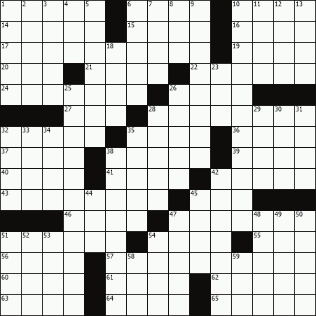 Across 1. Face protectors 6. Ness or Lomond 10. Film contemporary of Boris 14. Bandleader Shaw 15. Atlas stat 16. Midnight fridge visit 17. Satellite spiffer-upper? 19. Pisa’s river 20. McKellen or Holm 21. Trident prong 22. Happy hour buys 24. Solitary one 26. Caught in the act 27. Org. dealing with aliens 28. Famous 32. Classic toothpaste 35. Wealthy one 36. High point 37. Ancient letter 38. Prepared like shepherd’s pie 39. Spanker, e.g. 40. Travel guide list 41. Mideast’s Gulf of ___ 42. Midway alternative 43. Like shish kebab 45. Caesar’s salutation 46. Millennia upon millennia 47. Breastbone 51. Solidarity leader in Poland 54. Carson’s TV predecessor 55. “How was ___ know?” 56. Basketballer’s target 57. Harvest spiffer-upper? 60. “Bus Stop” playwright 61. Roller coaster feature 62. Cubic meter 63. Use a spyglass 64. Hard to hold on to 65. Cash in much of the continent Down 1. First Lady after Bess 2. Loud, like a crowd 3. Brit’s weight 4. Flesh and blood 5. Troubador’s verse form 6. Cleo or Frankie of song 7. Author Sarah ___ Jewett 8. Mediocre mark 9. Made tougher 10. Genius spiffer-upper? 11. Take home 12. Sausage unit 13. Commotions 18. Web page visits 23. Stutz Bearcat contemporary 25. Excavation spiffer-upper? 26. Mantle’s number 28. Collected clippings 29. March Madness org. 30. Kuwaiti bigwig 31. Editor’s excision 32. Pupil’s place 33. Music to slam dance to 34. Green Gables girl 35. Hell of a place? 38. Boat hanger-on 42. Beat to death, so to speak 44. Dawn goddess 45. Just ___ (not much) 47. Too sentimental 48. Fertilizer ingredient 49. In ___ (unborn) 50. Social customs 51. Tamer’s handful 52. Top-flight 53. Theater area 54. Fast Eddie’s game 58. Beluga delicacy 59. Erwin of early TV |