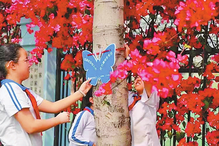 To mark this year’s National Tree Planting Day, which fell on Friday, many schools in the city held tree planting events to help their students learn the importance of trees and environmental protection. On March 10, 100 seventh graders from Shenzhen Foreign Languages School, together with some teachers and parent representatives, visited the Xiantong Sports Park on Wutong Mountain and planted 100 evergreen magnolia (Michelia maudiae) trees there. The trees formed a grove which was given the name ”Yuli Grove.” A stone-laying foundation for the grove was also held on the same day. Ouyang Aixiao, executive principal of the junior high campus of the Shenzhen Foreign Languages School, said at the ceremony that the name “Yuli” refers to the process of learning and understanding etiquette, and that the school hopes all of its students can become polite and gentle people in addition to achieving academic success. He added that planting 100 trees this year of the 100th anniversary of the Communist Party of China is also a way the school expresses its best wishes to the Party and the country. Nanhai Primary School in Nanshan District, in collaboration with the Dengliang Community, organized a tree planting event on March 12. The event began with a student representative introducing to all students via the campus radio the origin of the National Tree Planting Day and the role trees play in environmental protection. Students of each class then put up a board printed with an environmental protection-themed slogan created by the students on a tree on the campus, and made a promise to raise the trees together. After that, students of class 7, grade 3 formed groups of two and planted trees on the campus under the guidance of the school horticulturalist. (Yu Yuanfan) |