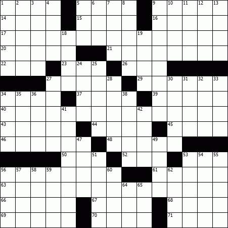 Across 1. Pigeon’s home 5. Batman = The _____ Crusader 10. Body of a ship 14. Unit of land 15. Winged 16. Murres 17. School of thought 19. Subconscious 20. Before, poetically 21. Egyptian peninsula 22. Eyeteeth 23. Reposing 25. Fine dinnerware 27. Regulation (abbrev.) 28. Diabetes sufferer 31. Choral group 34. Abstains from eating 35. Frozen water 36. Mentally irregular (slang) 37. Sheds 38. Enemies 39. Altitude (Abbr.) 40. Remedies 41. Wards (off) 42. Psychological disorders 44. Sick 45. Pontiffs 46. Characteristic of a goat 50. Brackish 52. Late 54. Do yourself 55. Region 56. Damsel 58. Glove 59. Straighten 60. Many millennia 61. Leisure 62. Nonchalantly unconcerned 63. Celestial bear Down 1. Escapade 2. Autumn color 3. Attempts 4. Snake-like fish 5. Outer covering of something 6. Lengthwise 7. Not Mama 8. Philosophers 9. Former North African ruler 10. Compassionate 11. Passing water 12. Waterhestnut 13. Boys 18. Willow 22. Little lies 24. Threesome 26. Derbies or berets 28. Valleys 29. Anagram of “Dice” 30. To tax or access 31. Family group 32. Puncture 33. Like triplets, except 8 34. Preclude 37. Cogitate 38. Sensed 40. Replicate 41. Pares 43. Spin 44. A type of tincture 46. Rums 47. Lazybones 48. Grain storage buildings 49. Doglike nocturnal mammal 50. Alike 51. Diva’s solo 53. Dogfish 56. Smear 57. French for “Water” |