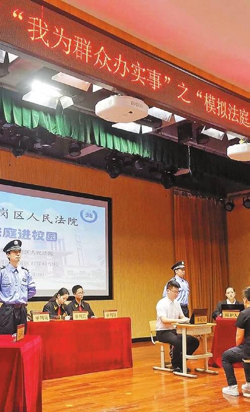 On March 30, Longgang Court presented a mock trial at Shiyaling School, Nanwan Subdistrict, Longgang District with 300 or so students and faculty members observing, and leaders from the court and deputies of the district people’s congress in attendance. The mock trial was based on a real case of criminal possession of drugs involving a 16-year-old defendant under the alias Zhou Yu who kept drugs in exchange of money. With two eighth graders’ participation playing the roles of judges, the mock trial reenacted the process of prosecution, defense and reflections from the legal representative and penitence from the defendant. During the Q&A session after the “trial,” the two “actors” shared their feelings as “judges” and students from the audience raised questions regarding the trial itself as well as those related to juvenile crime and anti-drug law. Deputies and the school’s vice principal Tang Jianwei praised the mock trial as a real life legal and ethical lesson which “can be seen, heard and felt.” They said that the mock trial helped students feel the majesty of the law and courts and raised students’ consciousness of rule of law. After the mock trial, the juvenile criminal trial team of Longgang Court presented law education handbooks that interpreted law through classic criminal cases. Since 2017 the Longgang Court has held 42 “Mock Trials Entering Campus” activities in primary and secondary schools in Longgang District and Dapeng New Area, with tens of thousands of people benefiting from the program. (Yang Mei) |